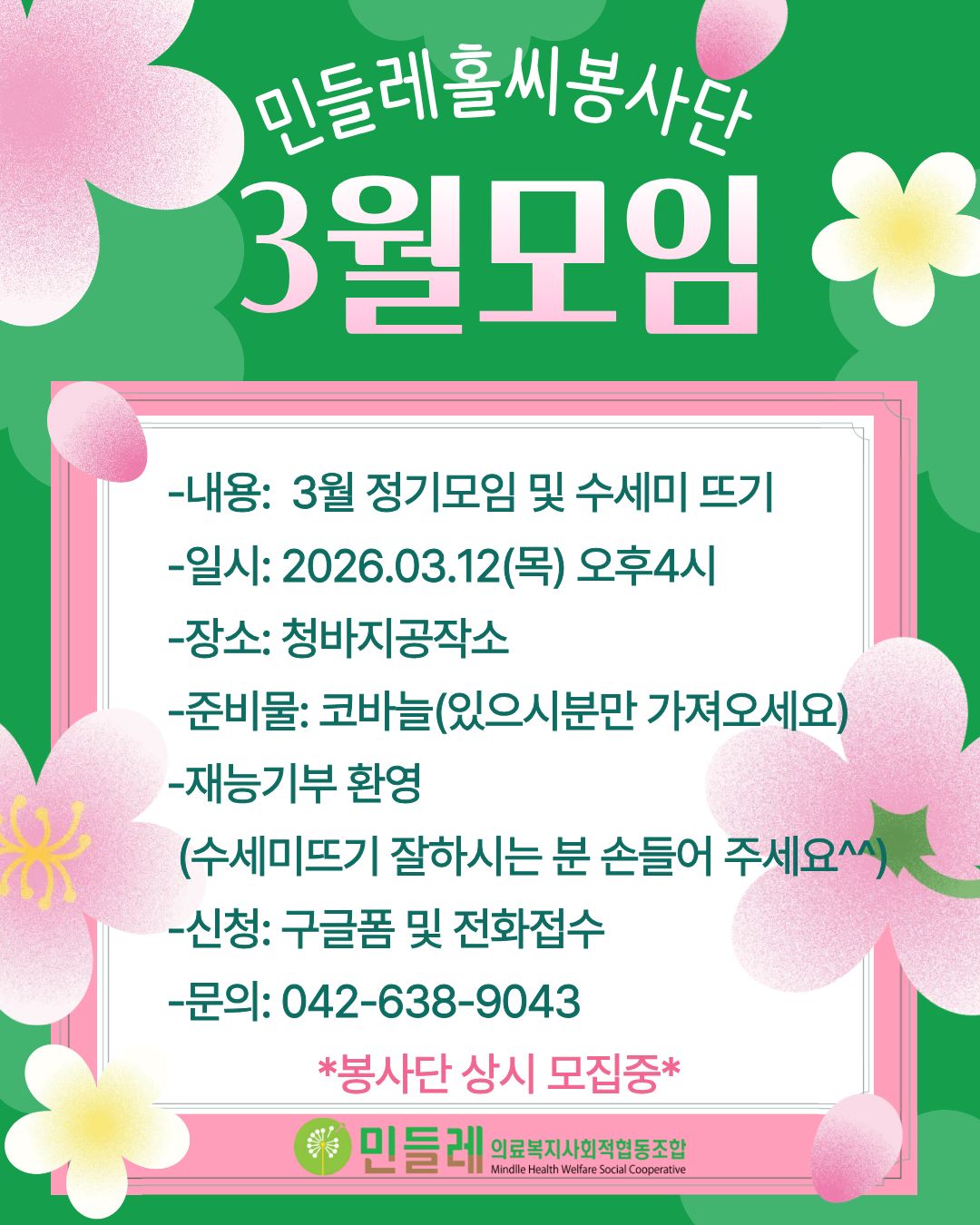 | 작성자 | 민들레의료복지사회적협동조합(mindlle) | 작성일 | 2026-03-03 | 조회수 | 1102 |