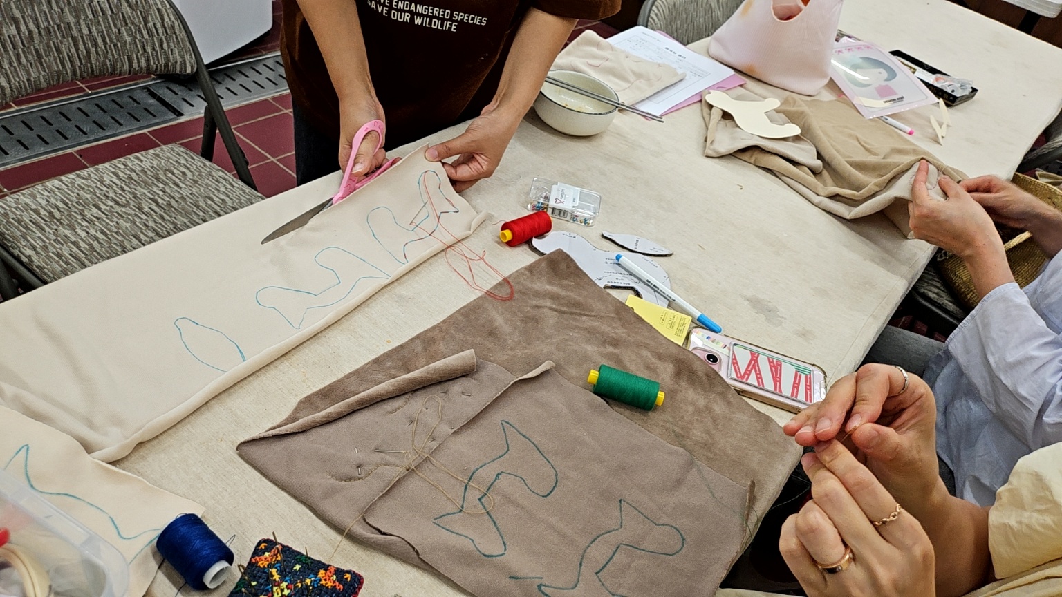 무엇보다 아이들끼리 모여 있으니 밥도 잘먹고, 놀이도 잘해서 엄마들이 작업하기가 수월합니다. 지난번에 이어서 바느질을 시작합니다. 천과 천이 이어지는 부분을 상상하고 재단하는게 쉽지 않습니다. 누군가는 척척 진도를 나가고 누군가는 어떻게 하는거냐고!!! 질문을 백번을 합니다. 백번의 질문을 모두 상냥하게 대답해주는 보살같은 어머님이 계셔서 오늘 모임도 평안하게 잘 진행되었습니다.