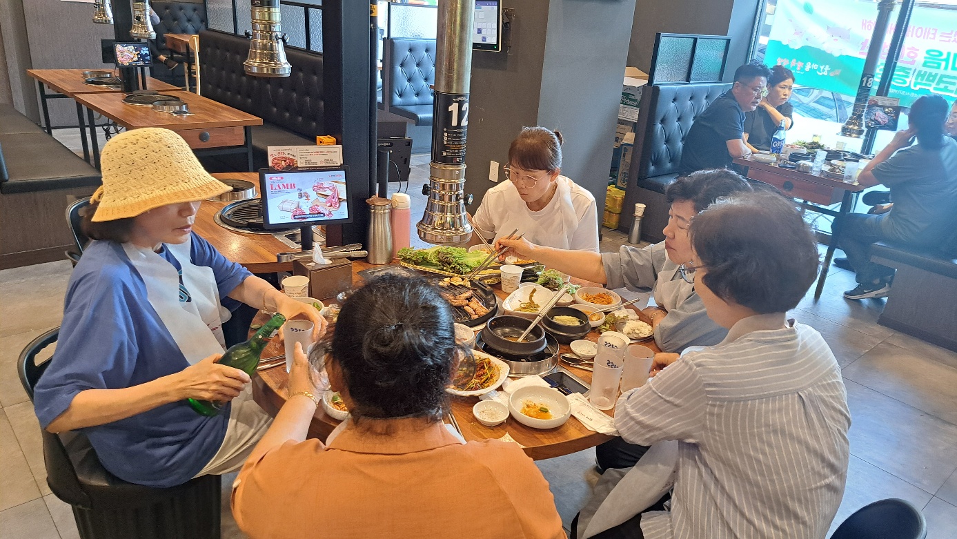 일주일에 한번씩 도시락 배달 봉사를 하지만 배달하기 바빠서 서로 소통이 잘 되지 않았는데 모여서 식사도 하고 운동도 하면서 서로를 이해 할수 있는 기회가 되어서 회원들 다 좋아하심. 근처 동춘당에서 에어로빅 운동도 참여하고 기구 운동도 함